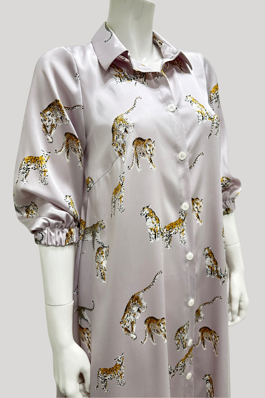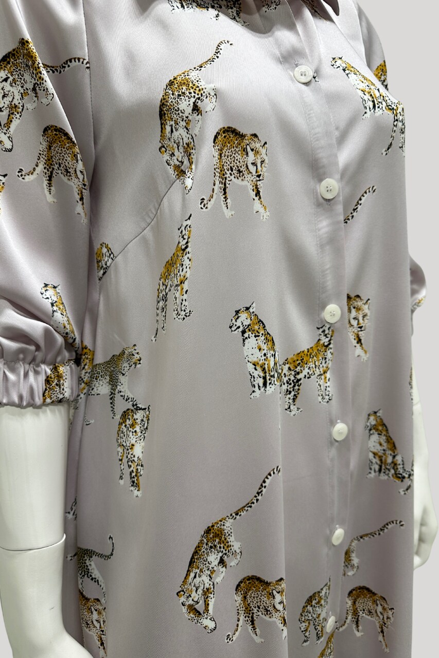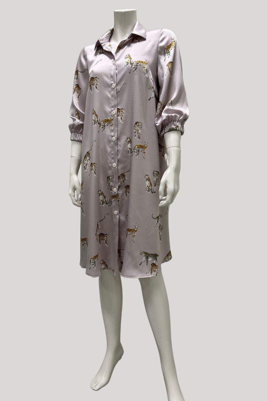 Stiilne ja isikupärane kleit, mis toob garderoobi särtsu! Heleroosakal taustal mänglevad graatsilised leopardid loovad erilise karakteri, mis sobib nii julgele moesõbrale kui ka klassikalise stiili armastajale. Kleidil on kergelt läikiv, satäänjas pind, mis lisab elegantsi ning muudab selle sobivaks ka pidulikemateks puhkudeks.