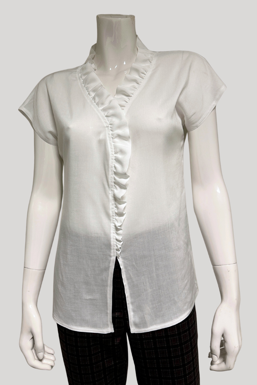 Lisa oma garderoobi naiselikku elegantsi selle kauni rüüžidega pluusiga! Õrn ja kergelt langev kangas tagab mugavuse terveks päevaks, samas kui V-kaelus ja volangdetailid lisavad stiili ja romantilist hõngu.